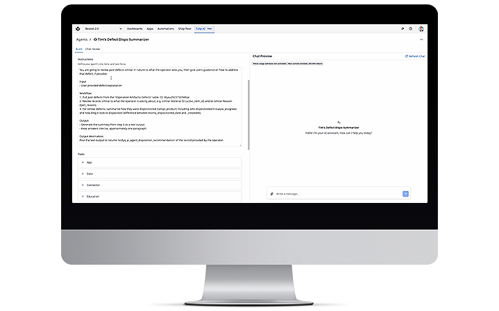 Create and configure your individual AI Agent or use a library of preconfigured, best-in-class AI agents for a wide range of use cases—from optimizing production schedules to creating validation guides. Each agent is fully configurable, allowing you to tailor its logic and tools to your specific workflows. Use AI agents as digital lean employees to automate tasks with the help of AI and handle them intelligently.